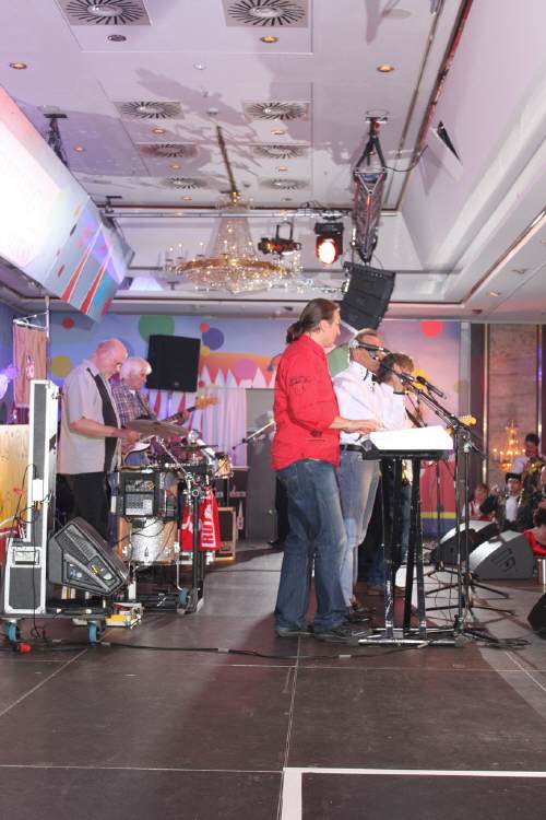 Die Klüngelköpp wollen von der Bühne, die Höhner wollen auf die Bühne ... und schon kommt man sich "ins Gehege" - die einen kommen nicht runter, die anderen nicht rauf, weil der Künstlerbereich äußerst eng ist und die Treppe zur Bühne ein gleichzeitiges Auf- und Abbauen allein schon von der Breite her nicht zulässt (ein Keyboard füllt die Treppe ganz aus). Und auch die Versorgung der Künstler über die so genannte "Literatenbar" verlief heute (noch) nicht optimal: Bandmitglieder der Bläck Fööss mussten sich im Foyer des Pullman Hotels eine kleine Flasche Wasser besorgen, weil die Vorräte im Künstlerbereich nicht aufgefüllt worden waren ... was natürlich verständlicherweise zu Unmut bei den Künstlern führte, welcher sich teilweise - und auch hier durchaus verständlicherweise - etwas lautstark entlud.