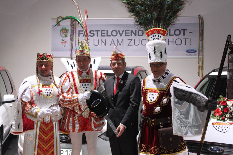 Hoher Besuch bei Ford in Köln-Niehl: An diesem Mittwoch hat Ford-Deutschland-Chef Bernhard Mattes das Festkomitee Kölner Karneval und das Dreigestirn im Beisein des Kölner Oberbürgermeisters Jürgen Roters zur symbolischen Wagenübergabe in den Ford-Werken begrüßt. Der deutsche Hersteller stellt seit nunmehr 62 Jahren die Fahrzeuge, mit denen Festkomitee, Dreigestirn und Kinderdreigestirn in der Session unterwegs sind sowie die Bagagewagen für den Rosenmontagszug.