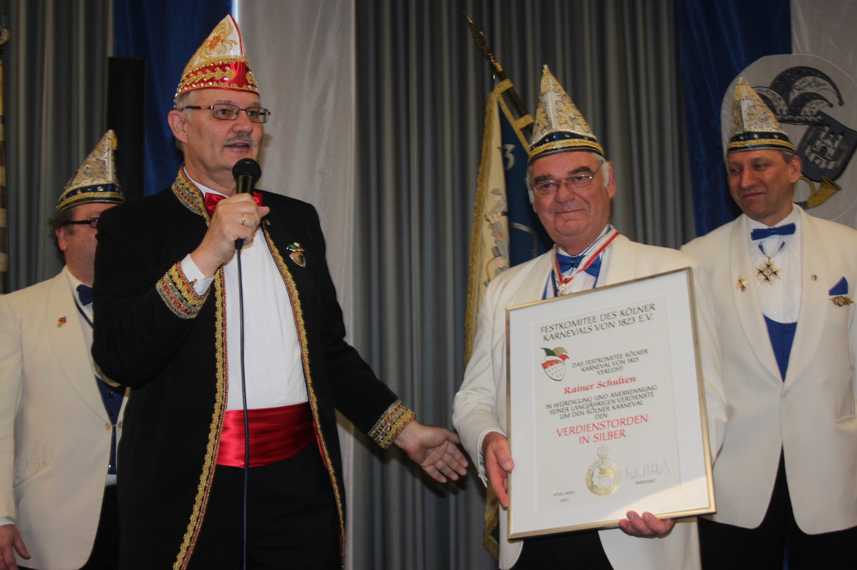 Nach der Begrüssung durch den Vorstand unterhielten Schlabber & Latz die geladenen Gäste, darunter eine Abordnung der Müllemer Junge, die Gäste mit ihrem Verzäll. Bevor es an einen Imbiss ging, zu dem die Gesellschaft eingeladen hatte, erhielt der Zugleiter der "Schäl Sick", Rainer Schulten, von Festkomitee-Vorstand Uwe Brüggemann den Verdienstorden des Festkomitee Kölner Karneval in Silber (Foto).